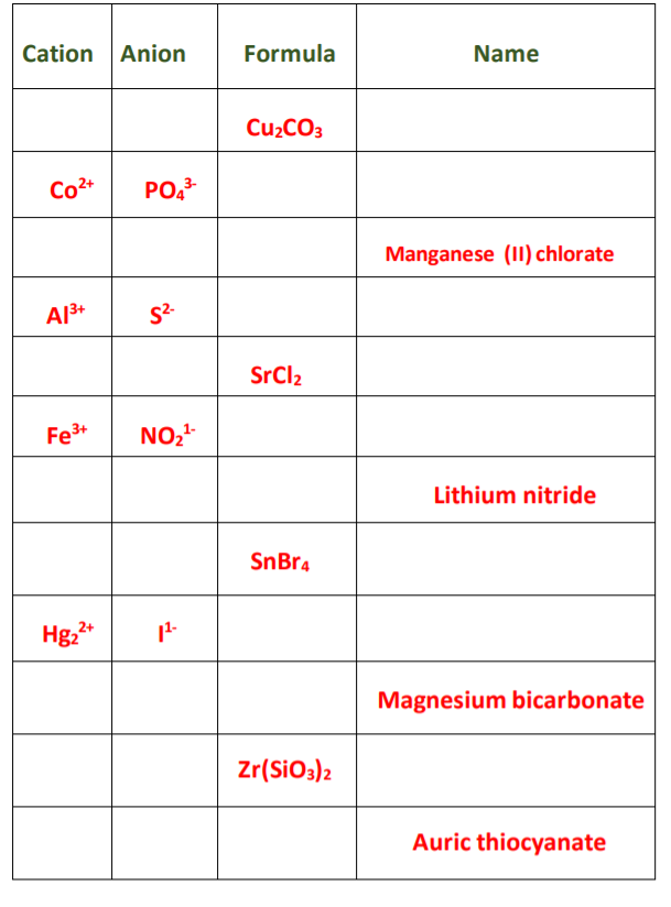 Solved Fil In The Blanks In The Table Cation Anion Formula Name Magnesium Bicarbonate Srclz Fe3 No Manganese Ii Chlorate Po Hg Cuzco3 50 Lithium Nitride 437 Snbr Co